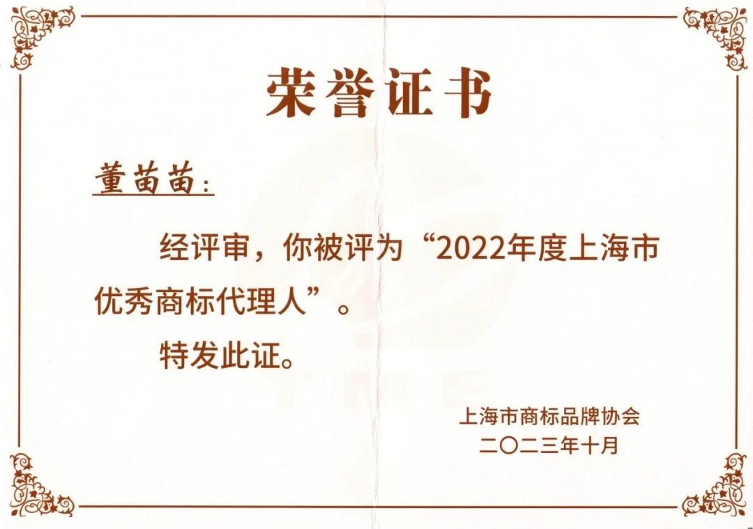 集佳上海分所董苗苗律师被评为2022年度“上海市优秀商标代理人”。