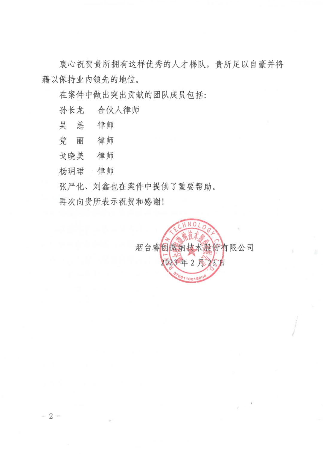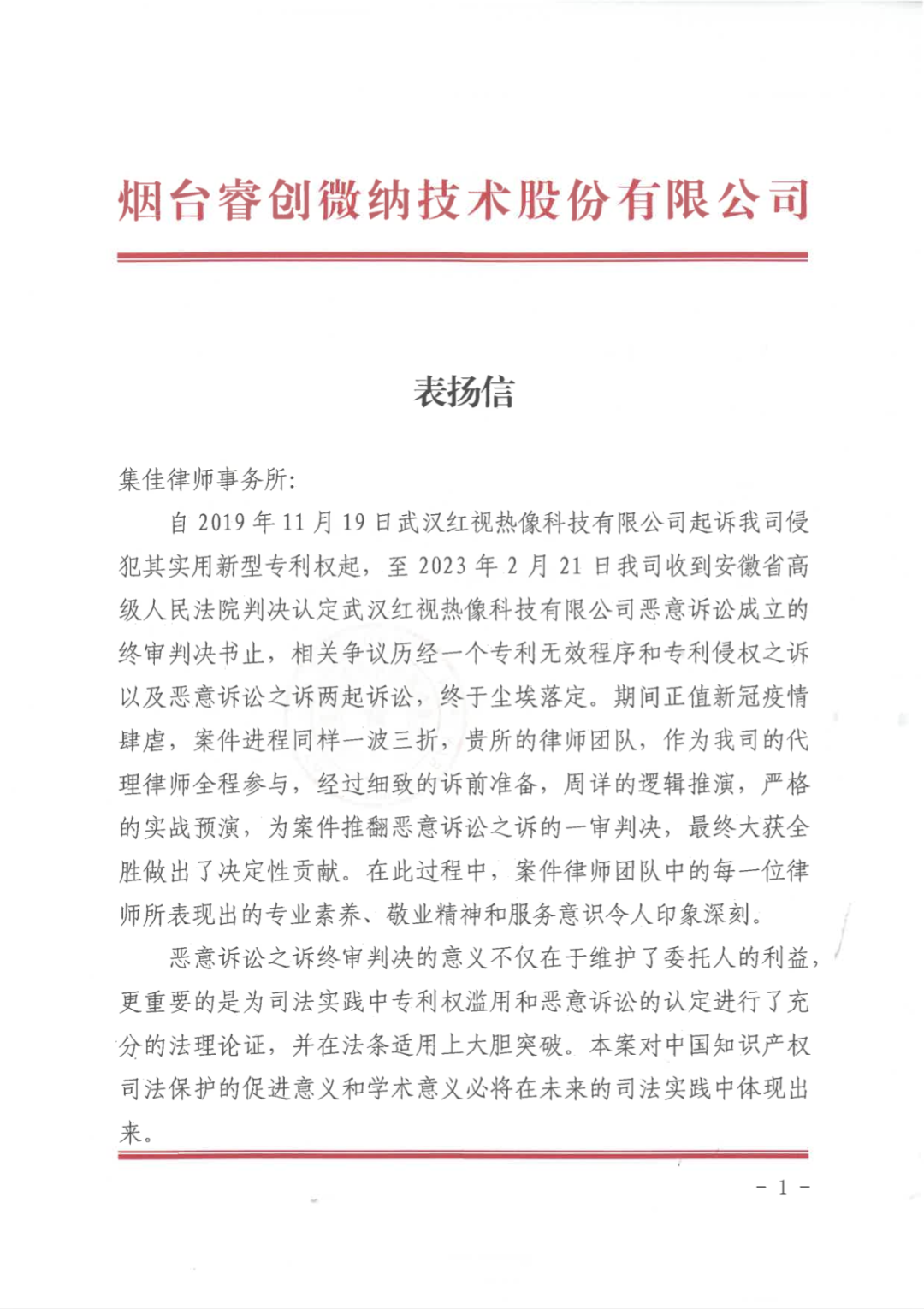 图1 睿创集团向雷速 (中国)官方网站-足球篮球直播平台寄送的表扬信