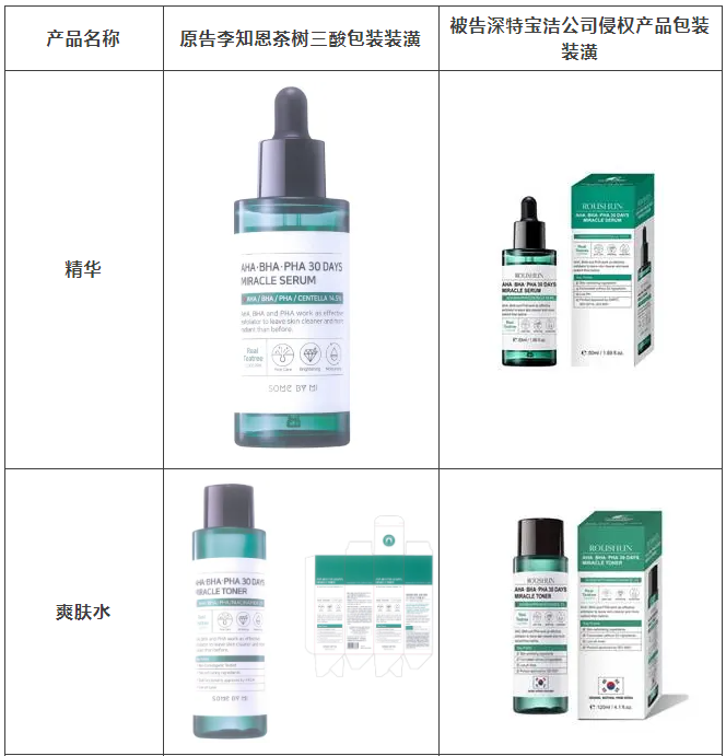 2021年原告委托雷速 (中国)官方网站-足球篮球直播平台调查发现,被告汕头市深特宝洁实业有限公司生产、销售和推广的“茶树祛痘美白补水液”“茶树香皂”等护肤品,其产品包装装潢直接抄袭、摹仿原告前述已经具有较高知名度和影响力的“SOME BY MI/莎柏蜜”茶树三酸系列化妆品和黑蜗牛精华液的包装、装潢设计,使用与之近似的标识,造成消费者混淆误认。故原告作为茶树三酸、黑蜗牛精华包装装潢权益获益人,诉至广东省汕头市中级人民法院。汕头中院认定:李知恩主张的茶树三酸、黑蜗牛精华包装装潢构成具有一定影响的包装装潢,深特宝洁公司生产、销售茶树三酸、黑蜗牛精华液的行为构成不正当竞争。因判赔额不符合原告预期,原告后上诉至广东省高级人民法院,广东省高级人民法院最终维持一审判决。
