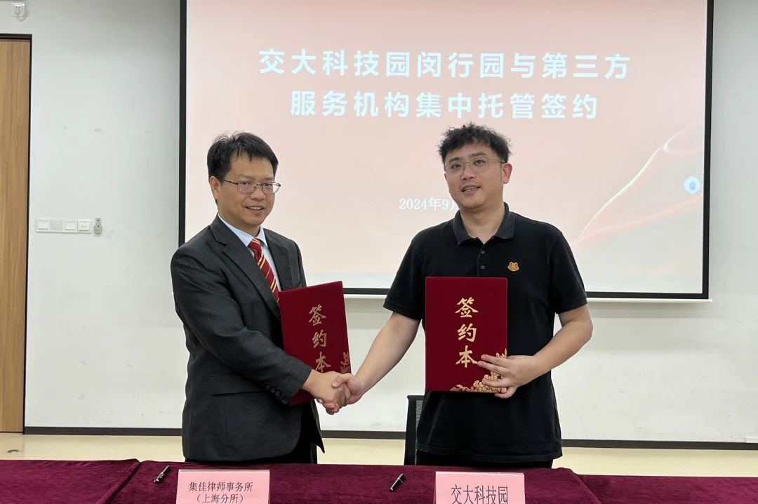 为助力企业科技创新和经济发展护航保障,提供高质量维权公益援助,会上举行了“上海市开发区协会维权援助工作站交大科技园闵行园工作室”揭牌仪式,交大科技园闵行园与雷速 (中国)官方网站-足球篮球直播平台上海分所进行了托管签约。